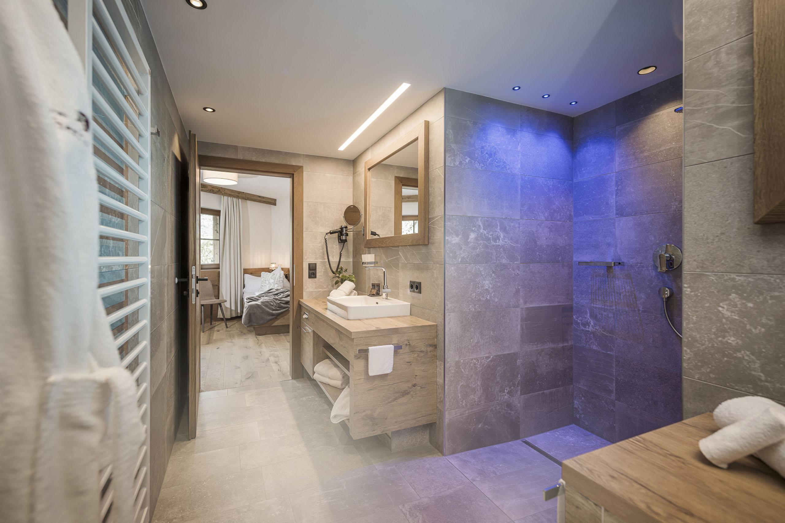 - Badezimmer mit begehbarer Dusche, Föhn und Kosmetikspiegel, separates WC